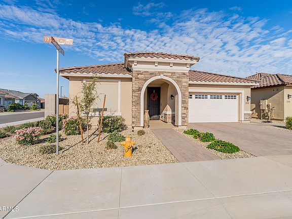 Like-new, one-owner home in the beautiful 55+ community of Heritage at Asante! This 2-bedroom, 2-bathroom plus den home offers an open floor plan with a spacious great room, dining area, and upgraded kitchen featuring quartz countertops, custom backsplash, stainless steel appliances, and upgraded cabinetry. Tile flooring throughout main areas with carpet in bedrooms. The large primary suite includes double vanities, a walk-in shower, and a huge closet. The backyard is designed for relaxation with an epoxy-coated covered patio, remote-controlled solar shades, turf, and a pavered walkway to the side of the home. The garage provides extra storage or workspace. Enjoy resort-style living in this gated 55+ community