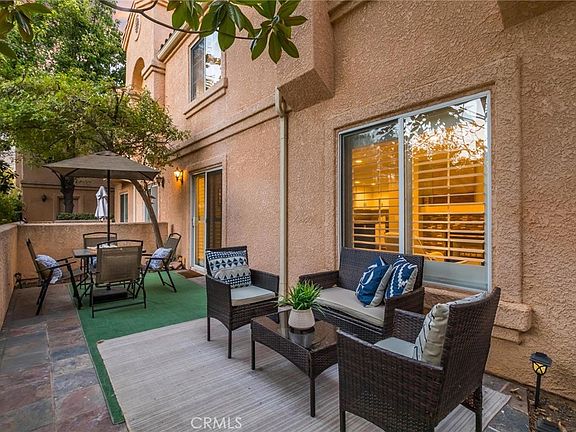 Welcome to this beautifully renovated townhome located in the highly desirable Diamond Head community of Stevenson Ranch. Spanning nearly 1,500 sq. ft., this residence offers three bedrooms and three baths, designed with an open floor plan and enhanced by neighborhood and park views from almost every window. Step inside to find rich wood flooring, plush carpeting, shutters, inviting paint selections, recessed lighting, designer fixtures, and expansive windows that fill the home with natural light. The remodeled kitchen is a true highlight, featuring sleek granite counters, seamless backsplash, abundant cabinetry with modern hardware, floating shelves, stainless steel appliances, and a breakfast bar ideal for casual dining. The spacious family room centers around a stacked stone fireplace, while the dining area is accented with an elegant chandelier and opens through sliding doors to an expansive private patio. Perfectly framed by lush landscaping and views of the playground, this space is ideal for entertaining or al fresco dining. The stylishly updated powder bath boasts new fixtures, lighting, and freshly painted cabinetry. Upstairs, the primary suite offers a private remodeled ensuite bath with a vanity topped with curated marble counters, floor to ceiling tile with mosaic accents, and a spacious oversized closet. Two additional bedrooms are generous in size with lovely views and ample storage. The updated hall bath mirrors the designer finishes of the primary, featuring a curated marble topped vanity and a custom tiled shower with mosaic detail. A convenient upstairs laundry area with washer, dryer, and extra storage completes this level. Additional highlights include an oversized two car garage with ample storage and the prime end unit location, close to the pool, spa, and playground. All of this is within close proximity to award-winning schools, shopping, dining, and convenient freeway access.