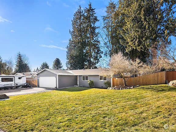 Lake Stevens, Total Remodeled Rambler, lite bright modern open spacious floor plan. Open Great room plan w/ a barely used wood stove. Large Gourmet kitchen w/new soft close cabinets, slab granite countertops, garden window. Newer SS Appliances. Large dining room. New Laminate plank flooring through great room & all bedrooms. Fresh new paint. Updated remodeled baths w/ quartz countertops, designer tile backsplash, new cabinets & sinks and ceramic tile floors. Private huge newly landscaped backyard w/ large covered patio. Storage shed. Newer roof & newer exterior paint. Oversize 2 car garage w/ newer garage door & pre-wired for electric car charger. Heat pump w/ mini split provides heat & A/C. New hot water tank. Double gated side yard for RV