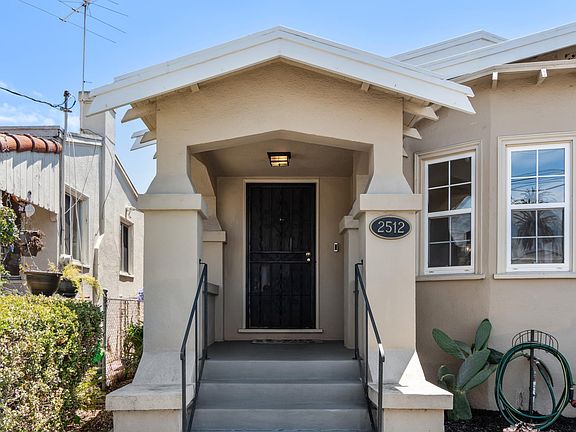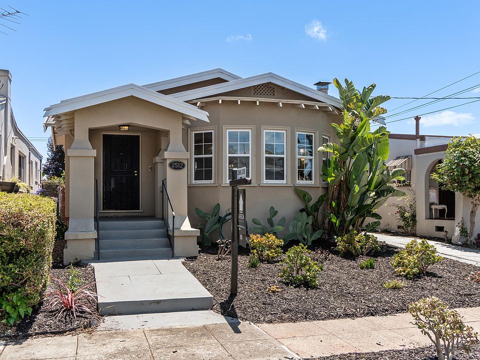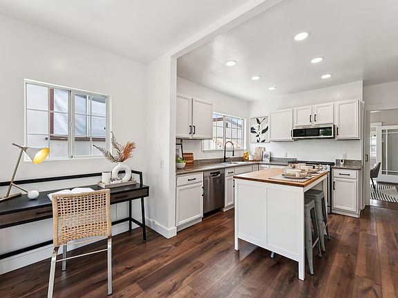 This updated Craftsman home includes hardwood floors, laminate flooring in the kitchen, an eat-in kitchen, a formal dining room with built-ins and French doors opening to a living room with additional built-ins, central heating, dual-pane windows, a dual-pane sliding glass door, and a new roof.