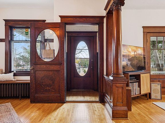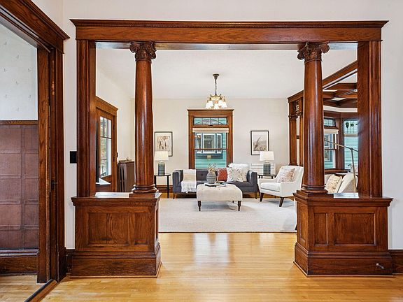 This exceptional Lowry Hill East residence has been meticulously maintained and thoughtfully updated by Awad & Koontz, preserving the integrity of its classic turn-of-the-century architecture while opening the main living spaces to create an airy, light-filled flow. Stunning original details include carved natural woodwork, coffered ceilings framed by wood columns, stained-glass windows, hardwood floors, historic porcelain hex tile, a mix of new lighting and original chandeliers. New transom windows, French doors leading to the rebuilt front porch, and reclaimed marble countertops sourced from the St. Paul Library add both charm and distinction.