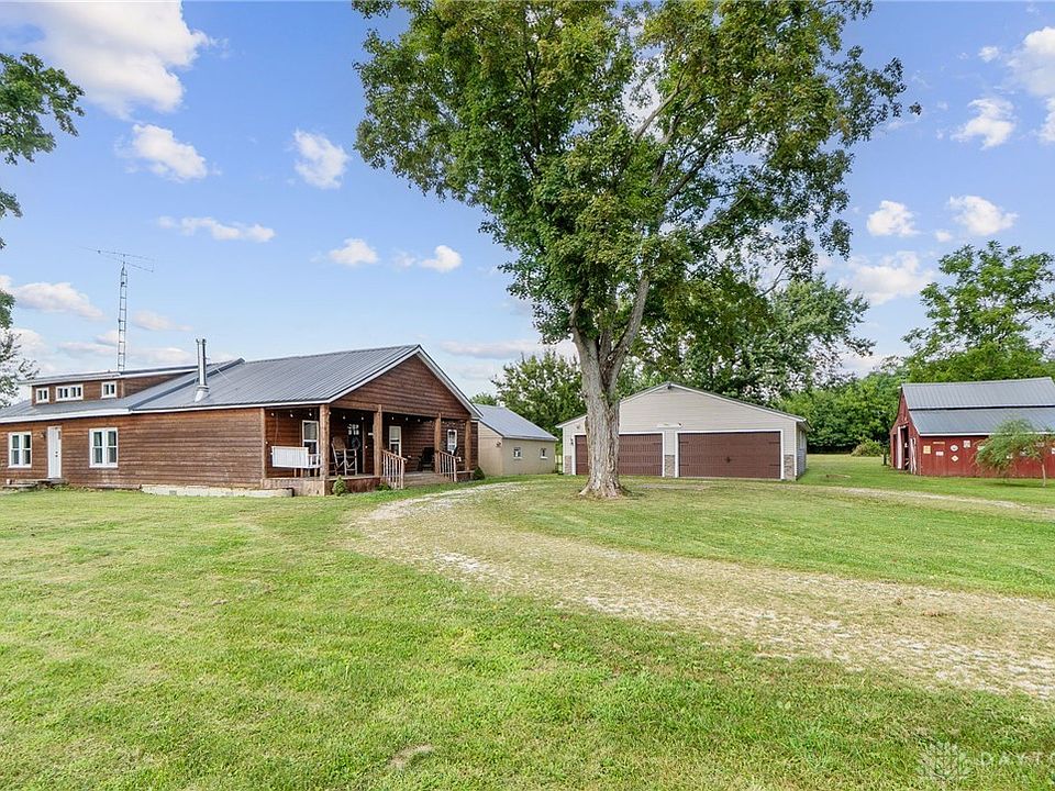 Presenting a rare opportunity to own over 5 acres in Beavercreek while being just minutes from The Mall at Fairfield Commons, this 4-bedroom, 2-bathroom home blends country living with city convenience. The 1.5-story wooden-built residence offers a charming front porch and an unfinished basement, perfect for storage or future expansion. Inside, vaulted ceilings create a spacious and inviting atmosphere, while the updated kitchen boasts ample cabinetry, modern appliances, and a functional layout. The large master suite features a beautifully finished master bathroom, offering a private retreat. Outdoors, the property includes a 4-car detached garage, a sizable pole barn, and a separate building currently utilized as a game room, complete with window units for year-round comfort. The well and septic system add to the property’s self-sufficiency. Whether you’re seeking room for hobbies, storage, or simply a peaceful setting close to amenities, this property offers endless potential.