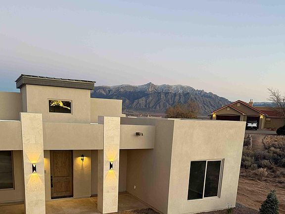 Custom Home Located in Rio Rancho on 1/2 acers with Amazing Sandia Mountain Views. This Beautiful Custom Midcentury Modern Home offers Mountain views from every direction, an open floor plan, tall ceilings with large custom wood beams. The cooks kitchen is complete with custom crafted cabinets, quartz counter tops. Stainless steel appliances. Large Center Island, Large Butler's pantry with loads of storage, Big Garage. Large, covered patio off the dining area. Conveniently located just a short 10 minutes' drive to I-25 and is close to restaurants and city amenities. Less than 25 minutes from Albuquerque and 35 minutes South of Santa Fe. Rio Rancho offers a thriving community with a rich artistic and cultural scene, as well as access to hiking trails and other recreational activitie