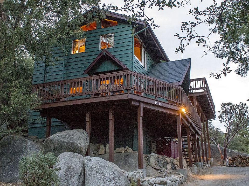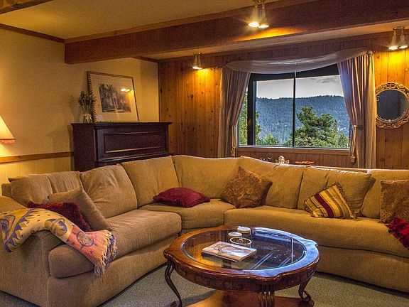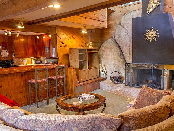 Drive up the private driveway to your own magical piece of Idyllwild. Enjoy the beauty and energy of this unique home built on the rock, with one of the best panoramas of the San Jacinto mountains and Tahquitz Rock! The main level enters a grand room w/high ceiling, open living/dining/kitchen and a massive boulder that is warmed by the fireplace! A few steps up takes you to 1bdrm/.75bath, plus utility room w/W/D hookups. Upstairs offers large sitting room/loft w/many windows + large private deck. Master includes more views + .75 bath. Extra room, once a healing room, now benefits as a is now the third bedroom. Deck living abounds on both levels, w/sunrise and alpenglow views to soothe the soul. Outside takes you up a walkway to a teepee and the sight of many drumming circles and spiritual events. Pluses are newly painted inside and out, new roof and partially furnished, including the piano! This property provides peace and beauty beyond words. This property provides peace and beauty beyond words. And yes, this is where the angels fly!