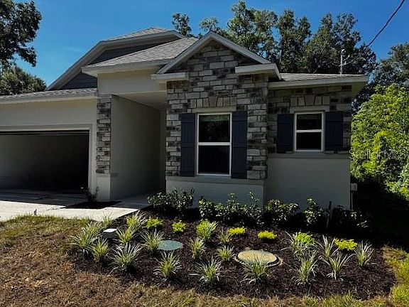 READY NOW! Nestled in the peaceful community of Mount Plymouth, FL, this home offers a tranquil setting with easy access to major highways, nearby parks, and Orlando attractions. Known for its quiet, rural charm, Mount Plymouth is the ideal location for those seeking a relaxed lifestyle while still being close to modern conveniences. Upon entering the Drexel floorplan, you are greeted by a spacious foyer with elegant ceramic tile flooring, which flows seamlessly into the open-concept living space. The 9' ceilings, complemented by tray ceilings, add a touch of sophistication and enhance the airy feel throughout the home. The gourmet kitchen, featuring a oversized island bar-top, wall oven, quartz countertops, and a stylish tile backsplash, is perfect for casual dining and entertaining. The adjacent breakfast nook offers a cozy spot for additional seating and meals. The expansive great room provides versatility, creating the ideal setting for both relaxation and entertaining. A den with double French doors provides an inviting space that can easily be customized to suit your needs, whether as a home office or a quiet retreat. The luxurious master suite is a true sanctuary, complete with a deluxe bath featuring a pedestal tub, separate shower, quartz countertops, shaker cabinets & many other premium finishes. The suite also includes a generous walk-in closet, providing ample storage space. Throughout the main living areas, the ceramic tile continues, adding both style and durability, while the bedrooms provide plush comfort. For true Florida living, the home also boasts a screened-in lanai, offering an ideal space for relaxing or entertaining while enjoying the outdoors in comfort. The home’s exterior is equally impressive, showcasing beautiful stone accents that enhance its curb appeal and character. Architectural shingles provide durability and add a refined touch to the roofline. Additional conveniences include no HOA fees and no water bill, offering greater flexibility and savings. The Drexel floorplan is designed with both functionality and luxury in mind, making it the perfect choice for those seeking a home that balances style, comfort, and practicality.
