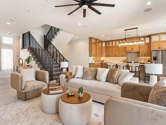 Lake Views, Beautiful location, 4 bedrooms, 65ft deep Pull Through RV garage, Pool/spa, and an office! Brand new stunning Kelco Home! Seller may Carry with creative terms and/or trades. Beautifully finished with custom designs and detailing! Open kitchen and living area leading directly to the large pool and entertaining backyard! Equipped with custom BBQ and access to the RV garage. Main level has 1 bedroom, Bathroom and an Office space! Upper level has a convenient Bar with R/O as well as the laundry room, 2 more guest rooms and the primary suite. Every room upstairs has access to a balcony to enjoy the beautiful weather Havasu has! The Lake views from the Owner's suite are amazing! The Extra Large dual vanity along with a dual headed shower creates the perfect blend of both functional and timelessness with the beautiful finishes in the primary bathroom! Located in the stunning Havasu Riviera, This community is one of a kind, embracing all of the beauty and incredible activities Lake Havasu provides! Now is your chance to be one of the first residents to enjoy this amazing location!