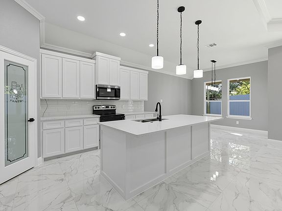 Cozy carpetStainless steel appliancesElegant ceramic tile flooringStunning quartz countertopsOpen-concept kitchenCrown moldingCustom white cabinetry