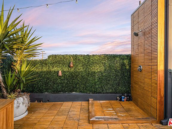"The Venice Art House", a James Bond architectural fully gated property with rare LAC2 zoning and two addresses in the heart of Venice. Between Abbott Kinney Boulevard and Lincoln, this compound is fully secured and private. The property features 3 beds and 3 full baths, with a rooftop outdoor shower, spa, infrared sauna, and custom sound. 11ft ceilings in the LR on the 2nd floor reach to 14ft in the open-concept kitchen with a stone bar, gigantic double-paned glass windows in the LR to limit sound, and ceiling to floor elegant custom drapes in the LR and BR. Black hardwood floors throughout, adorned with Timothy Oulton furniture set with vintage appointments, Miele appliances, thick steel beams, and elgantly bent iron railings. The first level features a 4-car garage, and a separate open studio space with its own entry and gate, polished concrete floors, rainfall shower, and it's own AC, kitchenette and washer/dryer. The house was built with sought after durability, including images of the build, and full blueprints. The spacious master bedroom offers British design, a beautiful custom walk-in closet, custom blackout drapes and curtains, and a private balcony. A spiral staircase above the kitchen leads to a library-movie room with four skylights, including one in the upper bathroom with full shower. A separate staircase from the LR leads to the rooftop deck featuring custom finished teak wood, lush California succulents and panoramic views from the palm tress in MDR to the hills above Sunset. Sun or work in privacy between the spa, fireplace and outdoor shower while listening to orchestra music above the city. The revenue from the separate studio and media area can be retained, currently ranging from $4,000-6,000/mo, or the entire main house can be leased for an additional projected $14,000-$15,000/mo or on VRBO and other platforms for more. With incredible versatility with LAC2 zoning, the entire three story property could also be transformed into a restaurant, lounge, gym, retreat spa, or media studio with remarkable possibilities. This is one of the rarest gems in all of Venice, offering a unique blend of privacy and security while allowing you to fully enjoy life in the heart of Venice.