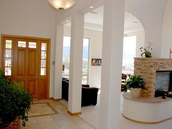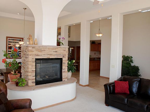 MILLION DOLLAR VIEWS!!Southwest Contemporary home with breathtaking views! Amazing 14 foot seamless Corner Window for glorious sunshine to fill this inviting living room. Formal dining room with two-way fireplace and new gorgeous porcelain wood-look tile adds elegance for your entertaining! Kitchen, the hearth of the home, is the center of the gracious great room and the open floor-plan makes it easy to cook and visit with anyone in the family room, living room or dining room. Casual family room great for kicking back for games or playing with the kids. Master bath speaks luxury; soak in the jetted tub, snail shower to boot! Huge laundry room, tiled counter with tons of cabinets and extra washtub. Backyard fully landscaped (70K+ in the past year), fire-pit,7 fruit trees, grass, and more!