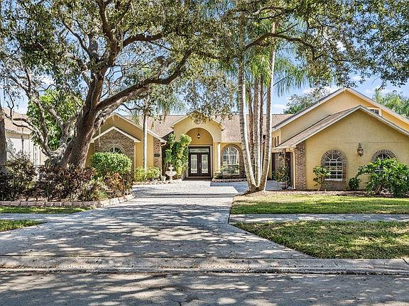 This home is truly a showstopper from the moment you arrive! Set on an oversized lot, with a brick-accented elevation and a side-entry 3-car garage, the curb appeal is just the beginning. You'll appreciate the expansive driveway, arched windows, and beautiful landscaping—all in a desirable, well-established community just minutes from everything this area has to offer. Step inside and be greeted by soaring ceilings, elegant woodwork accents, and an abundance of natural light. This home features new tile flooring throughout the main living areas. The heart of this home is the newly remodeled kitchen, which is every chef's dream, with modern granite counters, sleek new cabinetry, a center island, walk-in pantry, built-in microwave, convection oven, and a breakfast bar that opens into a cozy breakfast nook. Plus, a wet bar with a sink and wine fridge adds even more convenience and style. The massive family room is perfect for gatherings, with a wood burning fireplace, built-ins, large windows offering a beautiful view of the pool, and easy access to the kitchen. The split floor plan provides the ultimate in privacy. The master suite, located on one side of the home, is a peaceful retreat featuring a wood-burning fireplace and a custom-designed walk-in closet with separate his-and-hers sides and a mirrored changing area. The master bath is equally impressive, with a walk-in shower, jetted tub, and dual sinks. Adjacent to the master suite is a versatile office or nursery space. On the opposite side of the home, you'll find three spacious bedrooms and two well-appointed bathrooms. For added flexibility, there’s a 5th bedroom/bonus or media room upstairs, complete with its own private bath. The outdoor space is just as spectacular, with a covered lanai featuring an outdoor kitchen with Jenn-Air appliances, fridge, and sink. Enjoy the heated pool and spa with a waterfall feature, the lanai is outfitted with ceiling fans creating the perfect environment for relaxation and entertaining. This home is truly a rare find—don’t miss out on the opportunity to make it yours!