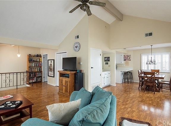 Move right in to this detached townhome with beautifully upgraded kitchen & baths. Open floor plan connects living room, dining area and kitchen. Kitchen has quarts countertops, stainless appliances, plenty of cupboard space and walk in pantry. Living area with fireplace, high ceilings, French doors to large deck + a powder room on same level. Huge master bedroom with dual closets and attached room that's perfect for nursery or office with access to large covered patio. Master bath is large with separate tub & walk in shower. 2nd bedroom has en suite bath. Plantation shutters throughout. Separate laundry room + 2 car attached garage. Great location sits high in the neighborhood capturing nice ocean breezes. Driveway on west side of house makes a great sport court. Convenient to schools, shopping, restaurants, beach, fwys. 2019-06-07