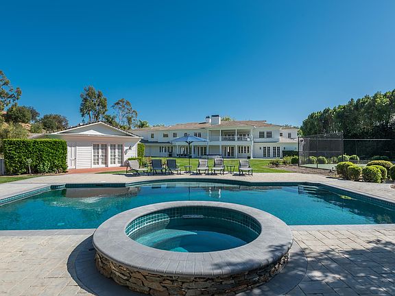 Nestled at the top of a quiet cul-de-sac and sited on 2.47 lushly landscaped acres in the prime Ashley Ridge section of Hidden Hills, this expansive, tennis court estate has been beautifully upgraded throughout with superb quality finishes, and is in turnkey condition. Features of the sunny, open floor plan include a spacious chef's kitchen with two islands & large breakfast room, that opens to the big family room with a walk-in fireplace & entertainer's bar, plus an adjoining custom home theater with upholstered walls, a big two-story library, a large mirrored gym, a bonus/game room, both living & formal dining rooms, each with a fireplace, a basement wine cellar, a Savant Smart Home system, and air conditioned garages for 10 cars. There are 8 big en suite bedrooms, all with newer baths, including the gorgeous master suite with large retreat, luxurious all stone bath, dressing room, massage room, 3 huge walk-in closets, and a large private balcony. The expansive grounds include a small guest house, full size tennis court, sparkling pool & spa, fruit trees, rose garden, lots of rolling lawns, and a barbecue center. (All furniture in the home is available for purchase with the home!)