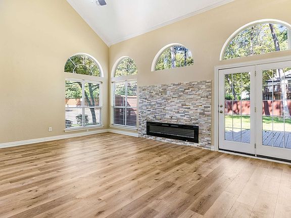 Corner fireplaceChipped stone fireplacePrivate backyardVersatile officeTranquil backyardExtended wood deckLuxury vinyl plank floors