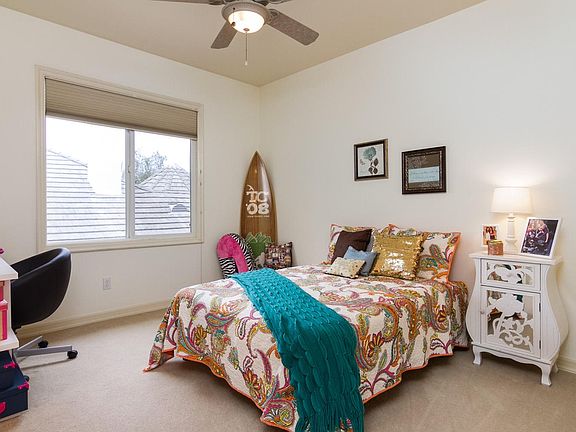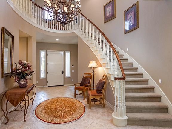 This lovely executive home is located behind the gates of Estates at North Pointe. Main features of this home include 5 bedrooms, 4.5 baths, plus an office and media room. The garages are both 2-car garage with direct access, and a 1-car garage. Flooring is absolutely gorgeous and includes hickory hardwood, travertine, tile and neutral carpeting. Kitchen is light and bright with white cabinetry, neutral granite countertops and top-of-the-line stainless steel appliances. There is one bedroom and bath located on the main level, and the balance of the bedrooms are upstairs. If you work out of your home, then you'll love the convenience of a formal office just off the living room, featuring a peek-through fireplace. The backyard hardscape and landscape are spectacular, making this home perfect for entertaining. Lovely pebble-tec pool, spa, waterfall, firepit, and plenty of room on side yard area for BBQ'ing on the built-in BBQ and simply enjoying the outdoors.