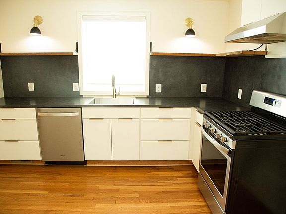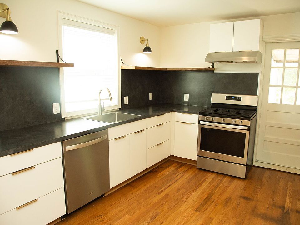 The updated eat-in kitchen is a chef's dream with a stylish black backsplash, updated cabinetry, stainless steel appliances, and open shelving. The newly remodeled main level bathroom features subway tile and updated cabinetry, making it the perfect place to unwind after a long day.