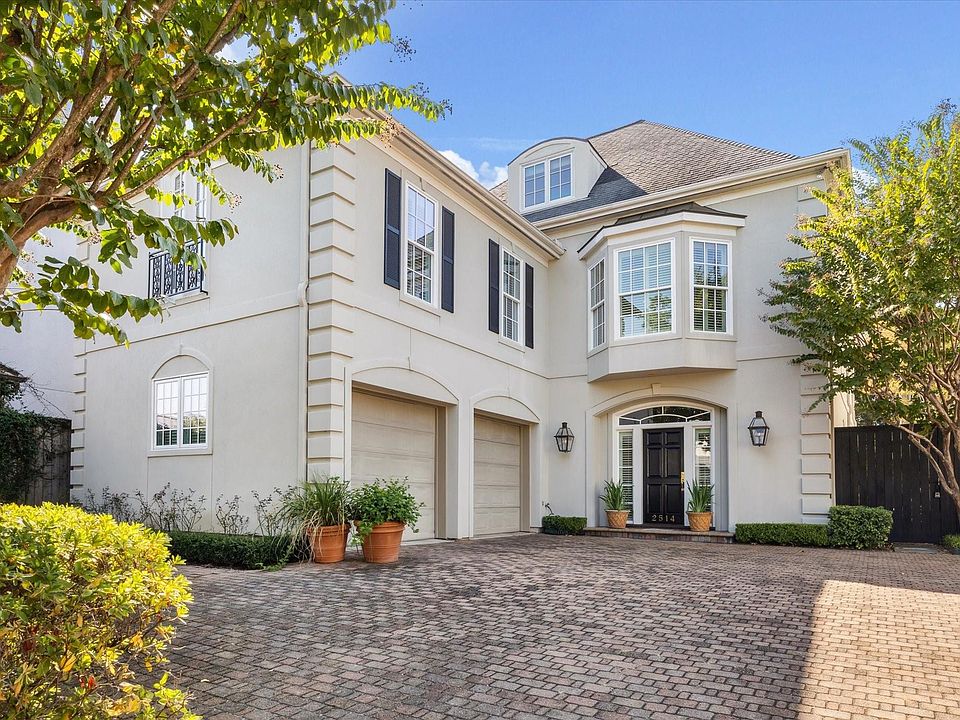 This gated Glendower Court home was designed by well-known architect Lucian Hood. Formal entry with high ceiling has stairs to the second level, elevator and powder bath access. Dining room with wet bar and wall of book/display shelving. Living room with fireplace overlooks the back patio. Island kitchen with breakfast bar seating opens to family room with a fireplace and access to the back yard and patio. Hardwood floors throughout. Upstairs to primary bedroom with high coffered ceiling and a fireplace. Two primary baths, each with large walk-in closets, share a walk-in shower. Two additional bedrooms with private baths. Office/sitting area at the stair landing with book/display shelving. Utility room. Third floor game room/bedroom with dormer window and full bath. Attractive and soothing patio fountain. Views to large oak tree. Separate back art studio/potting shed with A/C unit. Attached two car garage with great storage and lighting. Showings to begin at Broker Open on Tue. 10/28