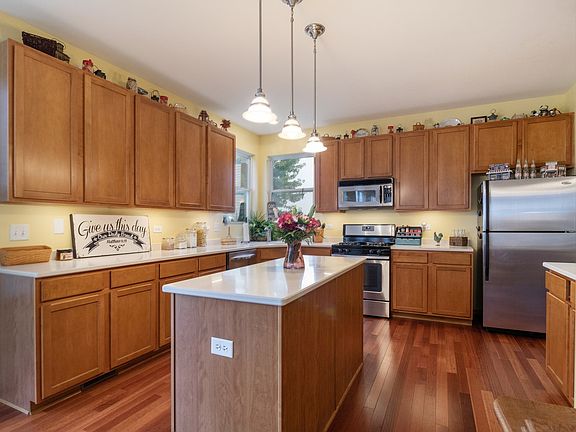 This Stunning home backs up to the pond with perfect views of the sunset! Beautiful gleaming hardwood floors in foyer, kitchen and dining areas. 42" cabinets in the kitchen along with new stainless steel dishwasher, fridge and oven in 2016 plus Corian counter tops. Open floor plan with wood burning fireplace in the family room. 9 ft ceilings on the first floor. Large Master Suite with spa like bathroom, soaker tub, separate shower and huge walk in closet. 2nd Floor Laundry room! Close to shopping, schools, parks. New water heater '17