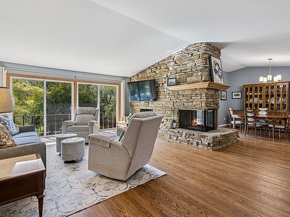 Perched high on nearly two acres in the desirable Tower Lakes community, this one-of-a-kind custom hillside ranch offers privacy, beauty, and year-round vacation living. Surrounded by mature trees, the home's open floor plan welcomes you with a striking three-sided stone fireplace that anchors the living and dining rooms, flowing into an eat-in kitchen with a large pantry, nearby laundry, and access to a charming screened porch. The office or nursery opens to a shared deck with the dining room, while the primary suite is a true retreat featuring floor-to-ceiling windows with serene wooded views, its own private deck overlooking the backyard pool, and a luxurious bath. The lower level extends the home's charm with a spacious family room, play/bar areas with another stone fireplace, sliding doors to a patio, and three additional bedrooms with a full bath. 2 & 1/2 Car Garage w/workshop area. Outdoors, enjoy the privacy of a large inground pool and the unmatched lifestyle of Tower Lakes with walking paths, tennis courts, parks, and lake access for swimming, canoeing & kayaking, and beachside fun. This exceptional home blends natural beauty, thoughtful design, and an unbeatable location-perfect for everyday living or entertaining in every season.