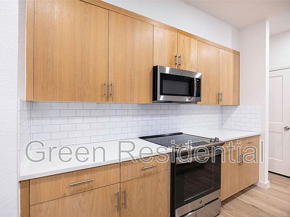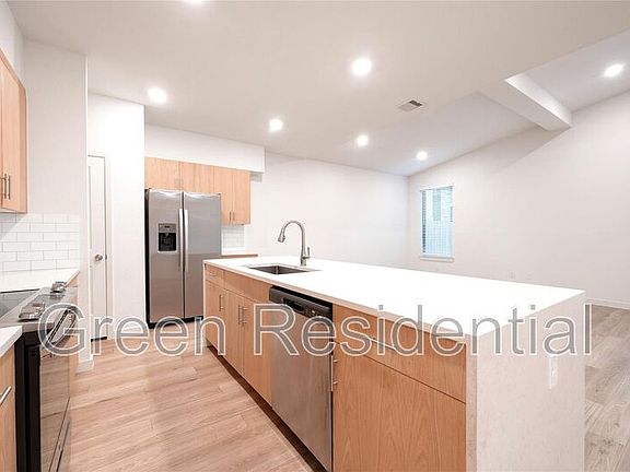 Modern Architecture Townhome ready for you now! First floor boasts bright open concept floor plan with high ceilings, gourmet kitchen with quartz waterfall island, featuring GE stainless appliances/fridge included, soft close cabinets and walk in pantry that overlooks the living room. Large utility room (washer and dryer included) and half bath downstairs. All bedrooms High Ceilings! All bedrooms have crazy high ceiling! primary bath has 5ft walk in shower, two separate vanities and a walk-in closet. Luxury vinyl plank flooring throughout. Back yard is fenced has a patio and full yard sprinkler system. Amenities: pets allowed on case by case basis