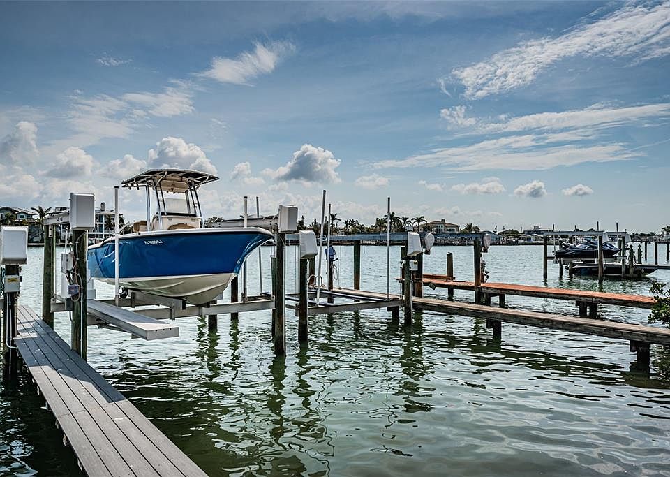 NEW PRICE!!! Take advantage of a great price and indulge in the ultimate Indian Rocks Beach and Florida lifestyle with this exquisitely updated 3-bedroom 3-bath waterfront retreat with a boat lift. Only about 400 steps to the white sandy beach, this meticulously designed and sophisticated unit boasts elegant wood floors, crown molding, custom electric shades, and custom blinds, creating an atmosphere of refined comfort. Downstairs, you will find a large ensuite with sliding doors and direct access to the pool. On the second floor, you will enjoy a second large bedroom, bath, kitchen, and large living area with sliders leading to a balcony with amazing views. Upstairs is reserved for the spacious primary bedroom, which features a balcony, skylights, and a sizable spa-like bath with custom closets. The residence also features hand-crafted stair rails, ceiling fans inside and out, large custom closets throughout, and glistening skylights for a light and bright feel. For chilly nights, enjoy a fire in the wood-burning fireplace. Step directly out to the sparkling pool and beyond to the breathtaking Intracoastal Waterway, where a 10,000 lb. boat lift awaits, perfect for boating enthusiasts enjoying a quick 10 minutes to the Gulf. Enjoy the convenience of a golf cart-friendly neighborhood, with an array of wonderful restaurants just moments away. For recreation and relaxation, a community park featuring tennis courts and a playground is conveniently located just one block away. This turnkey property offers seamless indoor-outdoor living, combining luxurious updates with the vibrant community atmosphere of Indian Rocks Beach. A large garage can hold all your beach toys, golf cart and your car. This is a rare opportunity to own a slice of paradise where waterfront adventures and community connections come together." Tampa Airport is just 35 minutes as is downtown St Pete.