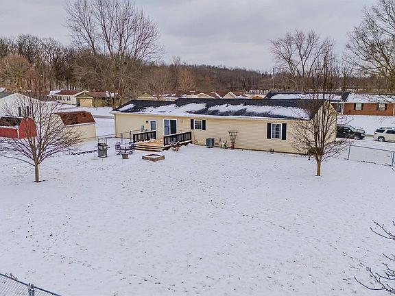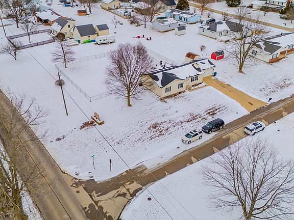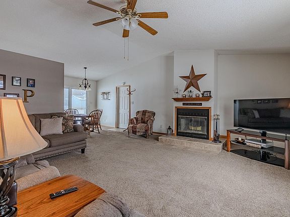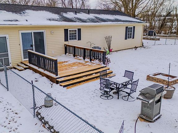 Welcome to this beautiful 3 bed, 2 bath ranch tucked away on the edge of town! Step inside an inviting open-concept living, dining, & kitchen area, highlighted by soaring cathedral ceilings. The cozy living room features a fireplace, while the kitchen boasts sleek quartz countertops & comes equipped with appliances- even a new washer & dryer! The primary bedroom has great space with private en-suite. Rest easy knowing the home has a new roof (fall of '24). Outside, the backyard is designed for relaxation, complete with fenced area for pets, brick fire pit & a storage shed. With city water & sewer, this home blends rural charm with modern convenience. Avg Electic $161, water $58