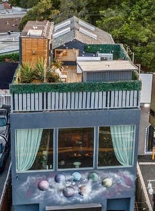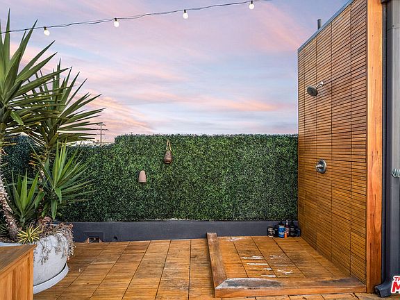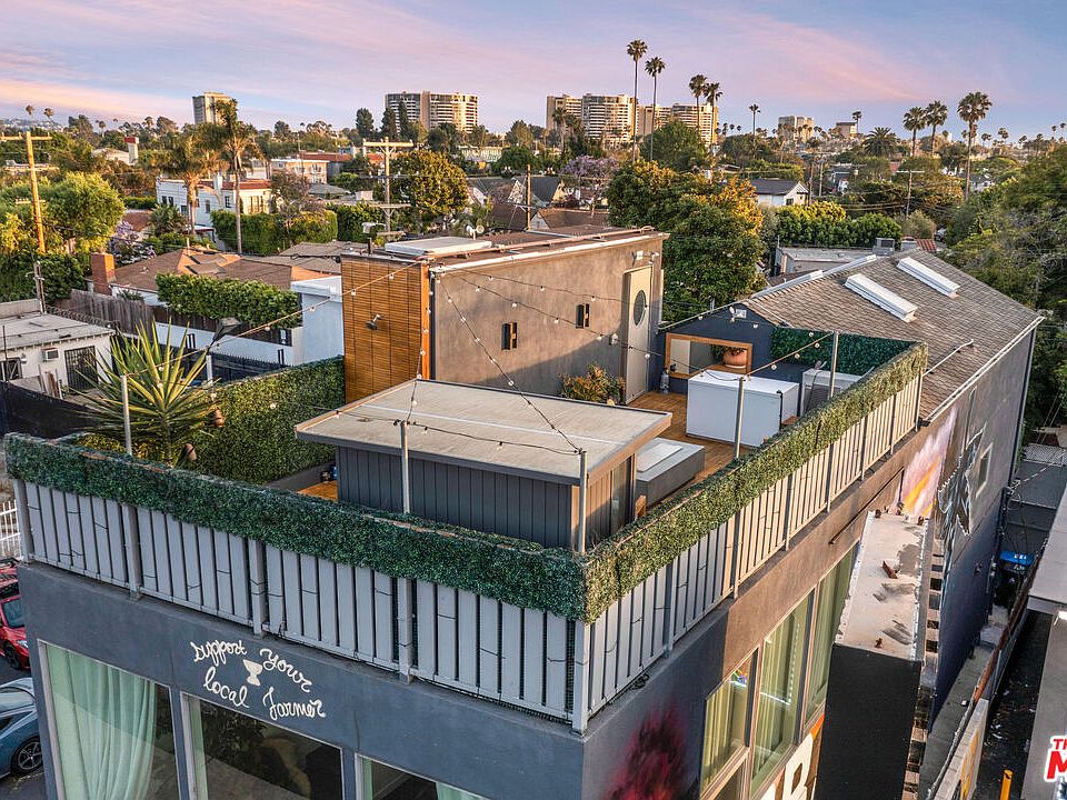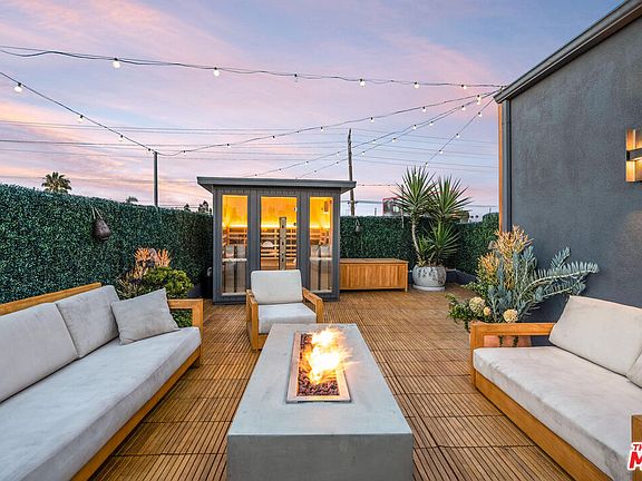 "The Venice Art House", a James Bond architectural fully gated property with rare LAC2 zoning and two addresses in the heart of Venice. Between Abbott Kinney Boulevard and Lincoln, this compound is fully secured and private. The property features 3 beds and 3 full baths, with a rooftop outdoor shower, spa, infrared sauna, and custom sound. 11ft ceilings in the LR on the 2nd floor reach to 14ft in the open-concept kitchen with a stone bar, gigantic double-paned glass windows in the LR to limit sound, and ceiling to floor elegant custom drapes in the LR and BR. Black hardwood floors throughout, adorned with Timothy Oulton furniture set with vintage appointments, Miele appliances, thick steel beams, and elgantly bent iron railings. The first level features a 4-car garage, and a separate open studio space with its own entry and gate, polished concrete floors, rainfall shower, and it's own AC, kitchenette and washer/dryer. The house was built with sought after durability, including images of the build, and full blueprints. The spacious master bedroom offers British design, a beautiful custom walk-in closet, custom blackout drapes and curtains, and a private balcony. A spiral staircase above the kitchen leads to a library-movie room with four skylights, including one in the upper bathroom with full shower. A separate staircase from the LR leads to the rooftop deck featuring custom finished teak wood, lush California succulents and panoramic views from the palm tress in MDR to the hills above Sunset. Sun or work in privacy between the spa, fireplace and outdoor shower while listening to orchestra music above the city. The revenue from the separate studio and media area can be retained, currently ranging from $4,000-6,000/mo, or the entire main house can be leased for an additional projected $14,000-$15,000/mo or on VRBO and other platforms for more. With incredible versatility with LAC2 zoning, the entire three story property could also be transformed into a restaurant, lounge, gym, retreat spa, or media studio with remarkable possibilities. This is one of the rarest gems in all of Venice, offering a unique blend of privacy and security while allowing you to fully enjoy life in the heart of Venice.