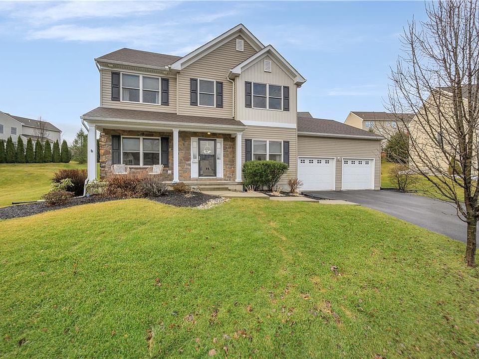Multiple offers highest and best by 10am on 1-30-23!!! This 4 bedroom 2.5 bath 2 story colonial offers 2,490sqft and is situated on a .32 professionally landscaped lot. The home offers a large eat in kitchen with hardwood floors, center island, tile backsplash, granite countertops, and stainless appliances. It is open to the family room with gas fireplace. The large dining room has hardwood floors, crown, chair, and picture frame molding. A first floor office with French doors, half bath, and first floor laundry room round out the first floor. The 2nd level offers a master bedroom suite with spa like bath, and 3 additional bedrooms and full service bath. Outside there is a concrete patio and room for a pool. The basement offers high ceiling, egress and could easily be finished off.