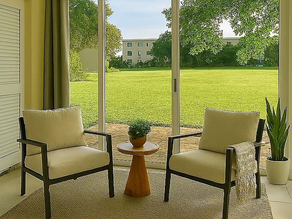 Village Royale ON THE GREEN...literally on the most amazing green open spaces with beautiful gardens. Step from your porch into Paradise. First floor unit with fabulous views. Freshly painted and ready for move-in, 1 bedroom 1.5 bathrooms condo in a 55+ active community. Community organized events , movie nights and clubs, so much to do in Clubhouse with theater, two pools, tennis courts, Bocce courts, Shuffleboard, gorgeous lawns with mature fruit trees, and sidewalks throughout. This unit is located very close to community Clubhouse and main pool, plus a short drive to shopping centers, restaurants, mall and movie theater. Retirement heaven, come join Florida living in style.