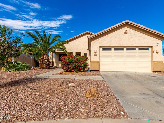 Welcome Home-This 4 bd 2 bath residence offers the perfect blend of comfort, style and functionality. Step inside to an open concept floorplan with a split primary suite for added privacy. The kitchen features quartz countertops, dark wood cabintry with 42 inch uppers, sleek black appliances and a large island-ideal for both everyday living and entertaining. Ceramic wood plank flooring & fresh two-toned interior paint scheme. Enjoy Arizona living at its best on this huge, private lot with a Pebbletec pool with water feature, outdoor bar area, courtyard, sunshades and plenty of space for entertaining. The extended 2 car garage includes a dedicated workspace area perfect for hobbies or extra storage. Modern and inviting this house is ready for someone to make it HOME Curb appeal and cute front covered patio greets you here. Other features include large garden tub and shower in primary suite with dual vanities. Prewired for surround sound in great room and recessed can lighting throughout. Don't miss this rare combination of a perfect floorplan and an incredible outdoor space!