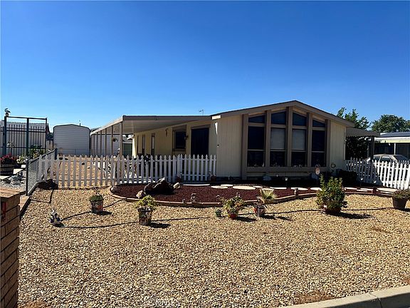 Peaceful Senior community. Large lot, RV Parking and carport large enough for 2 cars. Light and bright home with vaulted ceilings and open kitchen space, granite counter tops, upgraded cabinets and backsplash. Newer laminate wood flooring throughout the bedrooms and main living area. 2 bedrooms and bathroom. Main room has plenty of space for a large bed and includes a large closet. Separate laundry room inside home. Outside you will find a nice covered patio with views of the mountains. Low maintenance front yard, large lot with plenty of space between neighbors. Freestanding shed for extra storage, 220 volt and garden area with irrigation system already built in. Community is quiet and peaceful, well maintained, low yearly HOA.