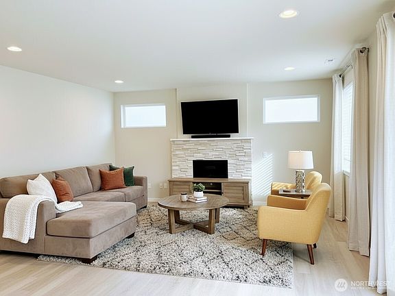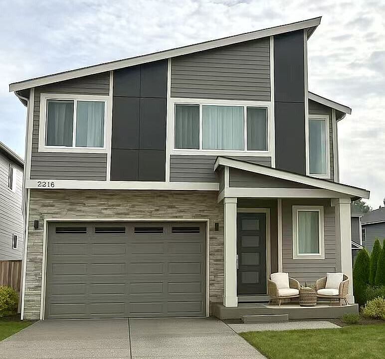 This stunning 2,501 sq. ft. home offers 4 bedrooms and 2.75 baths, including a desirable main-floor bedroom with adjacent ¾ bath. The entertainer’s kitchen boasts rich cabinetry, quartz counters, SS appliances, and a large center island with eat bar. Dining room opens to a covered patio, perfect for relaxing or entertaining. Upstairs features a convenient laundry, 3 additional bedrooms, and a spacious primary suite with full bath, dual sinks, and walk-in closet. Ideally located near shopping, schools, and with easy I-5 access. Photos virtually staged. Backyard green grass shown in photos is AI-generated for marketing purposes.