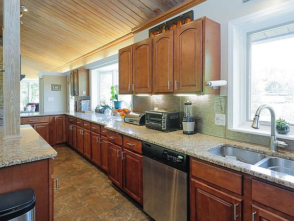 A lovely quad-level home on .65 acres with a pond/stream view in the front. Blue heron, great egret, swan, geese and duck occupy the pond. Dear, rabbit, woodchuck, squirrel, and many of Michigan's bird species occupy the back yard. In the morning there are often deer (usually fawns) and rabbits sleeping in the back yard in view of the master bedroom. The main level is open with a large stone chimney that supports a gas fireplace on the living room side, a franklin wood burning stove on the dining/kitchen side, and an additional wood burning stove in the level below the kitchen. The kitchen and dining area features a vaulted ceiling, 35 ft. of marble countertop, and 16 inch floor tiles. All rooms except the half bath have natural light, a lot of it. The living room, kitchen and sunroom all have views of the back and front yards, and the pond/stream.