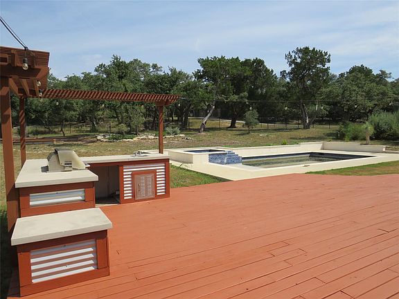 Rare REO opportunity in the exclusive, gated Hill Country community of La Ventana in Driftwood. Custom rustic home on acreage with private pool, outdoor stone fireplace, BBQ summer kitchen, and hot tub—perfect for relaxing or entertaining. Updated interior with open floor plan, cathedral-beamed ceilings, spacious kitchen w/ granite + butcher block island, and stainless appliances. Each bedroom features its own en-suite bath. Upstairs media room could be 5th bedroom. Primary suite has tray ceiling, dual vanities, jetted tub, and large walk-in shower.