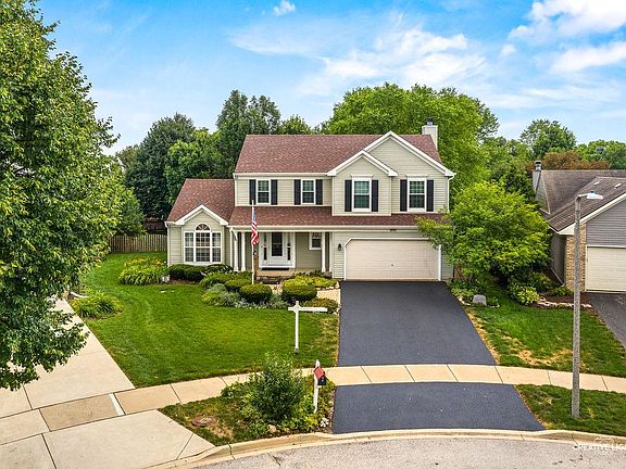Lovely home situated on premium large quiet cul-de-sac lot in golf course community! Huge fenced yard and nice deck to enjoy the summer days and nights! This home features a great layout with 4 bedrooms, 2.5 baths, a brick fireplace with adjacent bar area. Spacious kitchen with large double wide pantry. Kitchen opens to great family room with newer flooring. Living and dining room area are perfect for entertaining! Three spacious bedrooms with nice closets. Vaulted ceiling in master bedroom with 2 closets - one a walk-in. Large master bathroom featuring double sinks, vanity area, separate tub and shower! The partially finished basement offers more space to enjoy and there is also plenty of storage in basement. Lots of upgrades in 2020 include NEW roof, NEW gutters, NEW downspouts and NEW sump pump. New driveway in 2019, which was just resealed in July 2020. Water heater replaced in 2018. First floor laundry in mud-room off garage. Front upper windows have recently been replaced. House also features whole house fan. You will love the convenience of a central vac. Nicely landscaped including mature trees. Front yard views of the golf course. 13 MONTH HOME WARRANTY INCLUDED! Great location - very close to I-88, hardware stores, shopping, restaurants, and Fox Valley Park District. Come and see all this golf course community home has to offer!