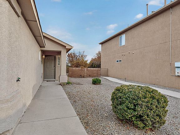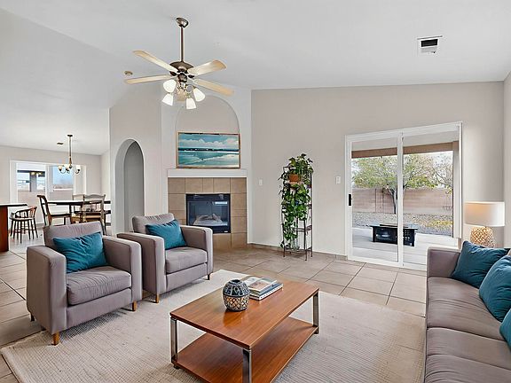 Move-in ready home in desirable Sungate Estates! Offering 3 bedrooms plus a bonus room with French doors, this flexible space is ideal for an office or guest room. The open floor plan features tall ceilings, a warm fireplace, and a kitchen island perfect for everyday living. The owner's suite is set apart for added privacy and includes a garden tub, separate shower, and walk-in closet. Fresh interior paint and abundant natural light brighten every room. Enjoy owned solar for energy savings, no backyard neighbors, and stunning Sandia Mountain views right from your yard!