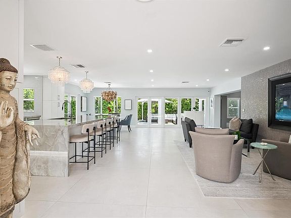 Coral Ridge luxury home in Bayview School District. Expertly renovated in 2021, this 3,011 sq ft, 3 bed, 3.5 bath residence features a metal roof, impact windows/doors, and an open-concept chef’s kitchen with Sub-Zero & Miele appliances, custom cabinetry, and oversized island. Two large first-floor ensuite bedrooms offer flexibility for guests or multi-generational living. The private upstairs primary suite includes a spa-style bath, walk-in closet, and covered balcony. Outdoor living boasts a heated saltwater pool, dining patio, and 4-hole putting green. Minutes to Fort Lauderdale Beach, shopping, dining, and parks.