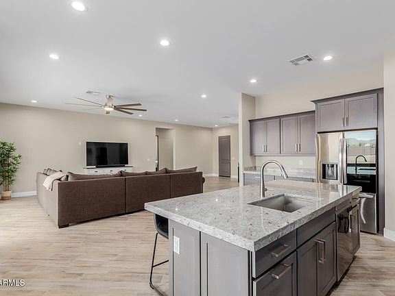 Immaculate 4-bedroom, 3.5-bathroom home with fully paved access, gently lived in and exceptionally maintained since its 2024 completion. Note: All photos shown are of the actual home. This home features a massive 47' x 19' RV garage that seamlessly connects to an additional 4-car garage, providing exceptional space for vehicles, toys, and storage. Ideally positioned directly across from miles of state trust land, the home offers uninterrupted views and a true sense of privacy. Inside, modern elegance meets everyday comfort with wood-look tile plank flooring, soaring ceilings, and a spacious open-concept layout. The inviting living room opens to a beautifully appointed kitchen featuring a large island with abundant seating, extensive cabinetry, stainless steel appliances, and a flexible nook perfect for a coffee bar, breakfast area, or reading bench. The backyard showcases stunning mountain views and a generous covered patio, ideal for outdoor entertaining or quiet relaxation. The fully fenced backyard offers endless potential, with ample space to add a pool, sport court, outdoor kitchen, horse facilities, or anything else you envision. With breathtaking mountain views, direct access to hiking and riding trails, and quick connectivity to the I-17, this move-in ready home offers the perfect blend of convenience, comfort, and natural beauty.