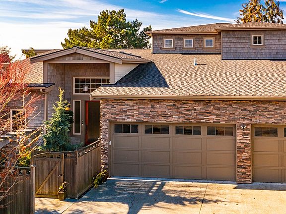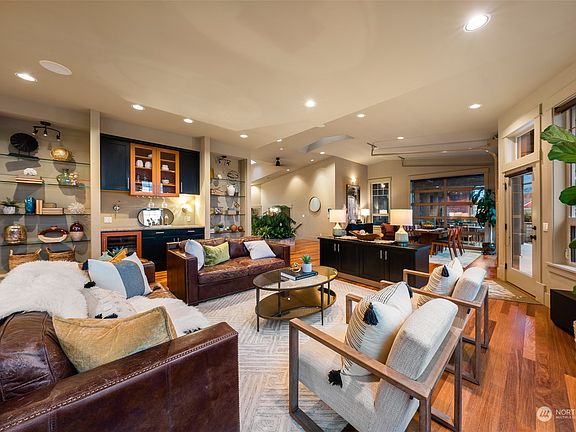 Exquisitely unique, expansive spaces with soaring ceilings, perfect for entertaining! Great room opens to top of the line kitchen and island that can seat 8, living and dining room with 2 glass rollup doors to let the outside in, opening onto the large deck. Deck has a covered dining area and uncovered relaxing space oriented to sound views and overlooks lap pool, gas fireplace, bbq area and cabana. Main floor has an impressive entry, den with fireplace, bedroom and 3/4 bath. Upstairs is a spacious view primary suite, full bath with steam shower, walk in closet plus sauna, utility room and extra room perfect for nursery or office. Lower level has large family room, 2 bedrooms, 3/4 bath, kitchen, sauna and laundry. Rare 3 car garage!