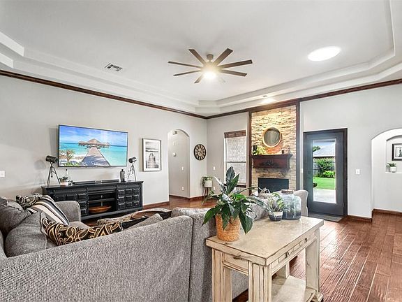 Step inside and prepare to be impressed—this home is packed with custom touches and thoughtful upgrades that truly set it apart. From the moment you walk through the front door, the beautifully engineered wood floors and spacious layout create an inviting and upscale feel. Just off the entry, a dedicated study with rich flooring provides the perfect space to work from home. The open-concept living room is both spacious and cozy, centered around a striking stacked stone fireplace that serves as the room’s focal point. Flow seamlessly into the chef’s kitchen, where you'll find granite countertops, a large center island, gas range, built-in stainless steel appliances, and a custom stone surround that ties the entire space together. A walk-in pantry offers even more storage. The home’s split floor plan gives the primary suite its own wing, providing privacy and comfort. This oversized bedroom easily accommodates king-size furniture and includes a cozy sitting area. The attached en suite bath feels like a spa, featuring double vanities, a soaking tub, separate shower, and a walk-in closet. On the opposite side of the home, you’ll find two additional bedrooms and a generously sized guest bathroom with a tub/shower combo—perfect for guests or family. Step outside to enjoy your covered back patio and fully fenced backyard, perfect for outdoor entertaining or quiet evenings under the stars. And when Oklahoma weather strikes, you'll rest easy knowing there's a storm shelter conveniently located in the three-car garage. Located in the highly sought-after Moore School District, this home is situated in a welcoming neighborhood with a community park and pool. Professional Photos will be on July 3rd