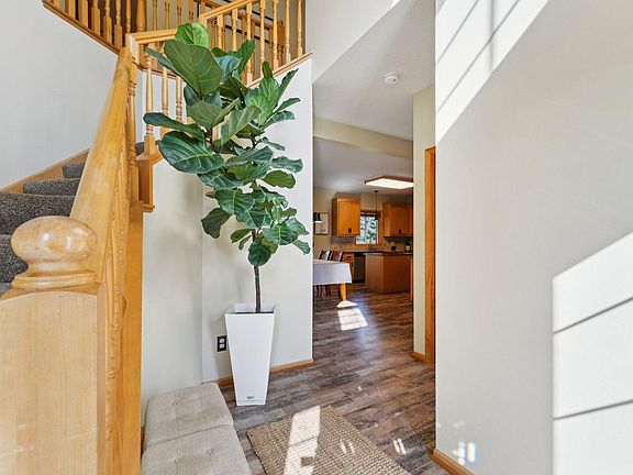 Welcome to a spacious 5-bedroom, 4-bathroom two-story home in the highly sought-after Eagle Valley neighborhood. Step into the bright and welcoming two-story foyer, where you'll find a convenient powder room and a light-filled living room with a gas fireplace. The formal dining area walks out to a beautiful deck on a large 0.29-acre corner lot—perfect for outdoor dining and entertaining. The chef’s dream kitchen features a center island, granite countertops, ample cabinetry, and a walk-in pantry. The main floor also includes a quiet, dedicated laundry room and a versatile flex room that can serve as a home office or bedroom. Upstairs, the private primary suite offers a full en-suite bathroom with a jetted tub and a generous walk-in closet. Three additional spacious bedrooms and a full bathroom complete the upper level. The finished lower level, featuring extra insulation, is designed for relaxation and recreation, offering a large family room, a ¾ bathroom, and additional space perfect for a home gym or game area. The 3-car garage with an enlarged driveway provides room for up to 9 cars. This home offers peace of mind with a new 30-year shingle roof (2023), a radon mitigation system (2024), and a SimpliSafe Security System (2025). It is conveniently located near excellent schools, parks, golf courses, and trails.