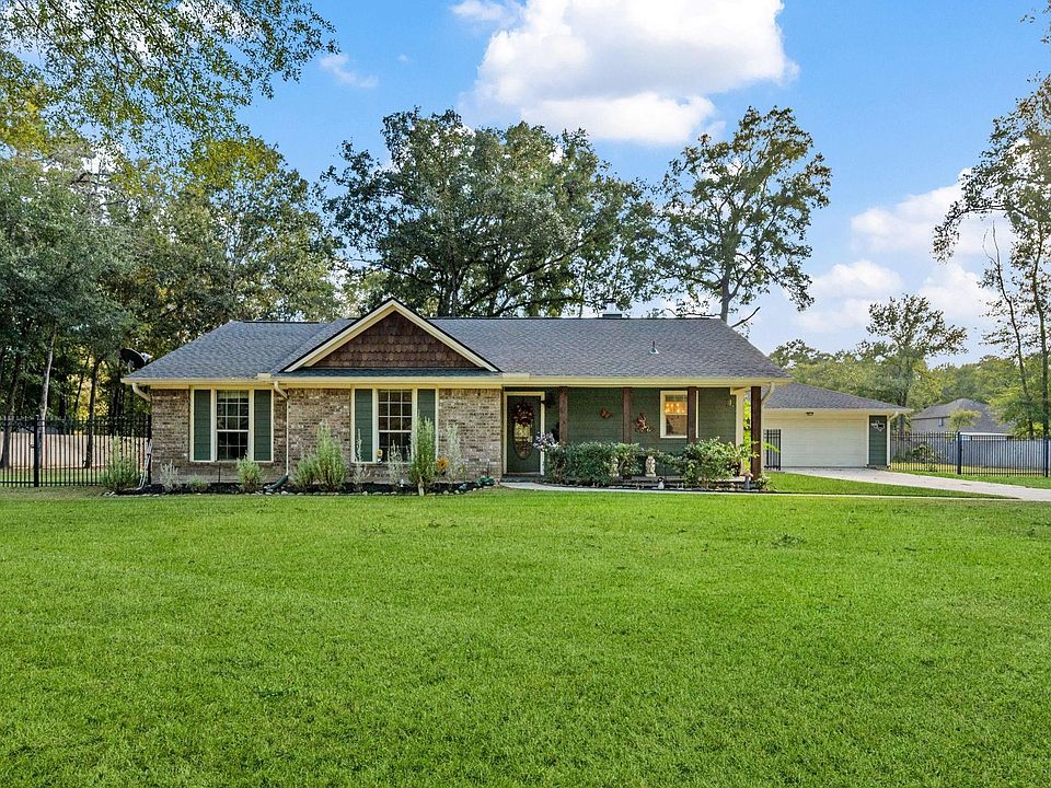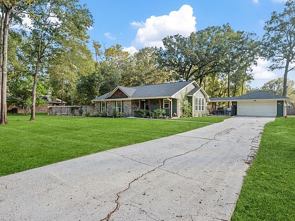 Nestled in the Roman Forest subdivision of New Caney, this one-story home sits on close to 1 acre of carefully graded land with attentive tree manicuring to maintain healthy greenspace. Upgraded to create a beautiful balance between the feel of country living and easy everyday comfort. New Roof (2023) – New Flooring Throughout (2021) – Wrought Iron Fence & Wood Fence (2020) – Full Irrigation System in Front and Back Yards – Full Gutter System with Leaf Guards – Whole House Water Softener – New Dishwasher (2021). Backyard features extended concrete screened patio (2024) PLUS paved relaxation area including: pergola with custom wrought iron panels (2024), updated electrical connections, outdoor kitchen setup area, and plenty of space for gathering. Community Amenities include: pool, park, and pavilion. Close Access to: 59/69, 99, 1485, Valley Ranch Town Center, and Randall Reed Stadium. Local shopping, dining and entertainment.