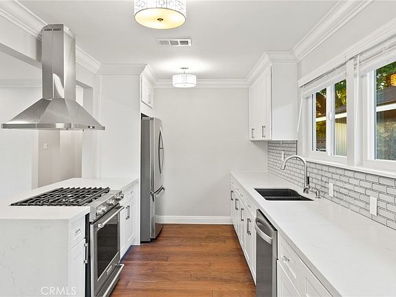 The kitchen has an abundance of white shaker cabinetry, easy-close drawers, quartz countertops with waterfall edges, a subway mirror glass tile counter splash, a KitchenAid oven with 6 countertop burners under a stainless steel range hood, a Whirlpool dishwasher, a double door GE refrigerator, a granite composition sink and kitchen pantry, and there is loads of natural light but also lighting fixtures throughout. A bright, modern, well-designed gourmet kitchen.