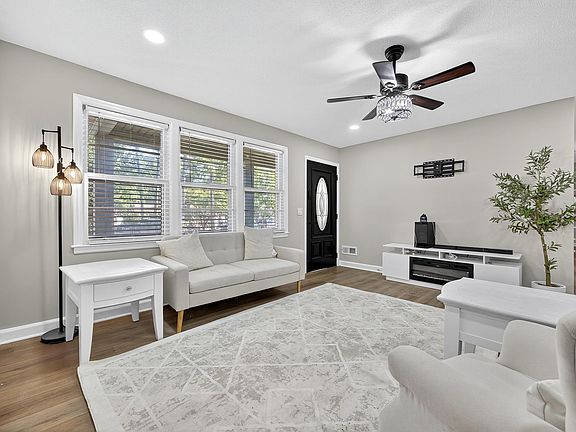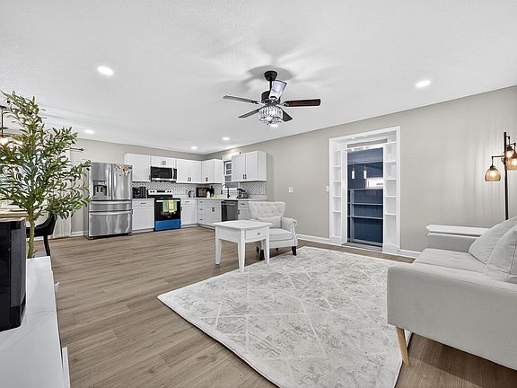 Remodeled ranch-style homeBuilt-in shelvingEat-in kitchenStainless steel appliancesOpen concept designVersatile flex spaceQuartz countertops