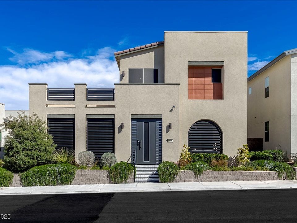 Stunning model home, move-in ready, with nearly 3,500 sq. ft. of luxury and almost $300,000 in upgrades. Featuring two primary suites—one on each level—this residence leaves nothing to be desired. Enter through a wrought iron courtyard into a dramatic entry and open living space. The chef’s kitchen boasts GE Monogram appliances, custom cabinetry, granite counters, and a huge walk-in pantry. An office with glass barn doors and built-ins adds elegance. The first-floor suite includes dual closets, spa bath, and a multi-slide door to the courtyard. Upstairs, the loft offers theater potential. Entertain in style with a spa, fountain, covered patio, and two multi-slide doors for indoor-outdoor living. A three-car tandem garage features epoxy floors and EV charger. The low-maintenance yard is fully covered with paver stones & desert landscaping. Enjoy balcony views of the Strip, city, and mountains. Located across from the private community pool and close to shopping and parks!