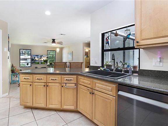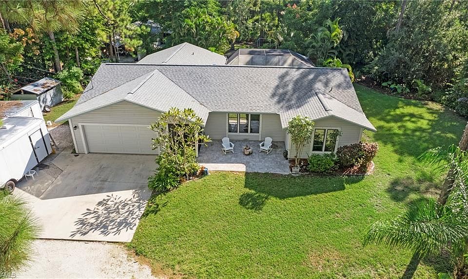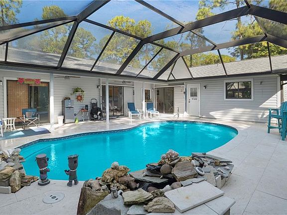 Escape to your dream retreat on 1.25 acres in highly sought-after San Carlos Estates, where you can finally spread out to your heart's content in a true tropical oasis offering unparalleled space, privacy, and freedom with NO HOA dues or restrictions. This residence has been extensively upgraded starting with major systems like a new roof (2025), new HVAC system installed in the main house (2024), a new septic and drain field installed (2023) and a new well pump put in place (2024). The exterior is well-appointed, featuring a new front paver patio installed (2023) and a shell driveway redone (2023) plus a new hurricane-rated garage door. The stunning backyard pool area was upgraded in 2022 with a deck extended with new travertine tile , a new PebbleCrete pool surface , a waterfall feature , a new cage with a picture window and an added salt system. Just outside the pool cage is a homemade sand beach sitting area adorned with palm trees. You'll also find RV and boat parking with water/electric hookups , a treehouse/playground built around a poinciana tree, and a new irrigation pump (2025). Inside the primary suite was beautifully remodeled (2018) with a walk-in shower, glass door and new plank tile flooring. Just off the primary bath is another wonderful space for an exercise room, home office, nursery, etc. The main house features new kitchen appliances (2021) and a new water heater (2023). Adding to the property's flexibility is a non-conforming 2-bedroom, 1-bath guest house , which has its own new HVAC and ductwork installed (2019) and new appliances (2018) . A new roof for the guest house was installed (2018) and includes a open porch deck to sit and enjoy the SW Florida outdoors. Don't forget an additional 16x18 shed for storage space/workshop and chicken coup attached. There are also additional sheds on the property for even more storage. The options and creativity to this property are endless.