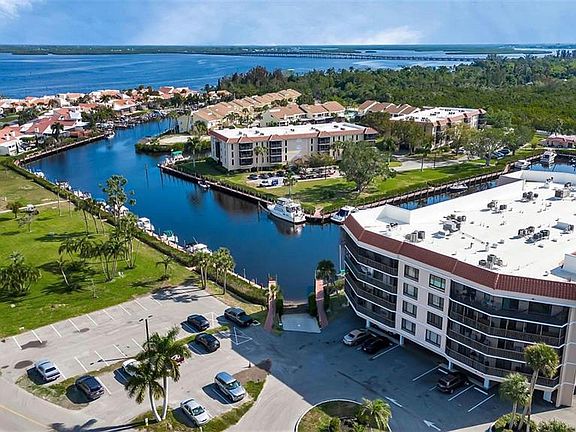 Calling all boaters and tennis lovers! Emerald Pointe is the place for you and is located on the Peace River! The gated community with security guard offers a marina with 4,000 feet of assigned boat dockage, 4 clay tennis courts, a pickleball court, 3 swimming pools, a clubhouse, fitness room, boat and RV parking and so much more! The naturally bright condo comes furnished, has gorgeous views of the water and faces east so you can enjoy the amazing morning sunrise and boats going in and out from their excursions right from your screened lanai with shade blinds or the comfort of your home. This beautiful unit is open and airy and the entry to the primary bedroom has been opened up to allow more light and water views with a large entry and pocket doors. Truly a wonderful addition that you won't see in the other condos. Although it is technically a one bedroom since the 10.11' x 10.11' den or additional room doesn't have a closet, it can easily be used as a 2nd bedroom and even says that it is a 2 bedroom condo on the property appraiser website. The kitchen with granite counter tops has an exquisite custom copper inlay in the ceiling with additional lighting for added ambiance and custom tile that complements the cabinets beautifully. There is a private storage room specifically for the unit just feet away for convenience in storing all of your holiday decor, tools, luggage, etc. and an assigned covered parking space with additional guest parking near the building. Located just 9 minutes from the Punta Gorda Airport, 8 minutes to downtown Punta Gorda for fine dining and entertainment and 12 minutes to Fisherman's Village! The condo fee ensures hassle-free living including a 24 hour manned Security Gate, lawn care, cable TV, internet, water, sewer, trash removal, maintenance of all exterior and communal spaces, heated pool and a lot more. Set up an appointment today to see all that this fabulous condo and community has to offer you and your boat and tennis rackets!