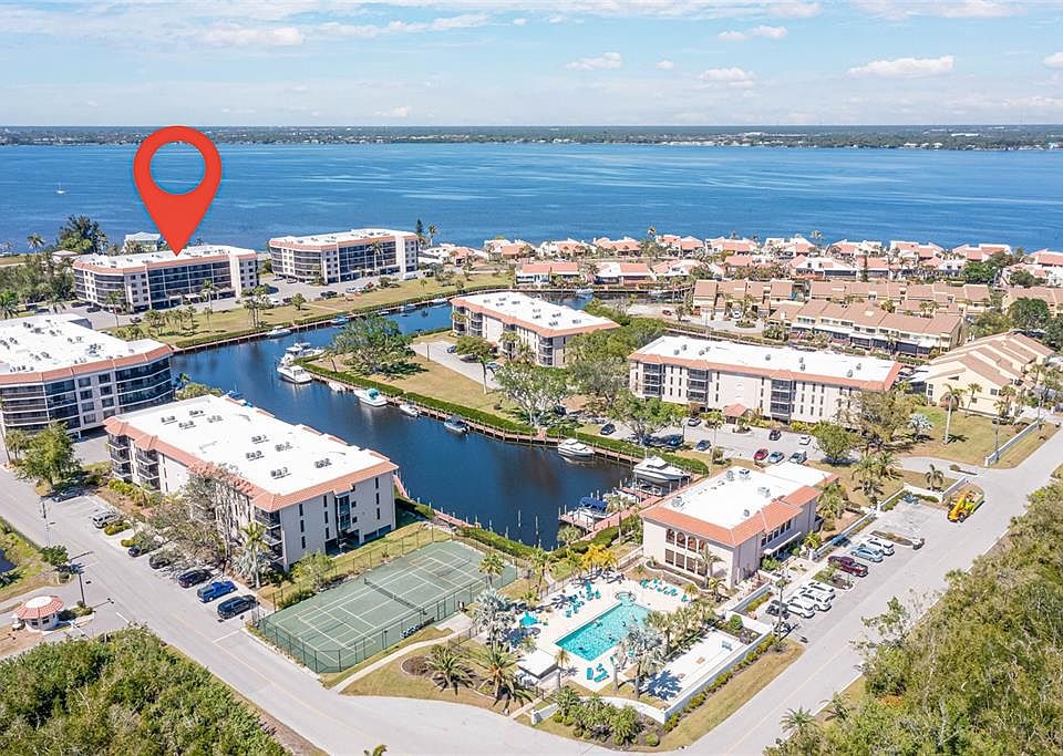 WATERVIEW CONDO IN EMERALD POINTE! UPCOMING DESIRED AREA! This beautifully UPDATED, FULLY FURNISHED one-bedroom, one-bath condo includes a BOAT SLIP and use of the community Boat ramp Great amenities include CABLE, INTERNET, WATER/SEWER, RV & BOAT STORAGE, MARINA, 4 CLAY TENNIS COURTS, PICKLEBALL, 3 SWIMMING POOLS, CLUBHOUSE, GYM, PUTTING GREET, LIBRARY, RESTAURANT ON PREMIS, TRASH REMOVAL, PEST CONTROL, FLOOD INSURANCE, LANDSCAPING and opportunities to meet new friends through the many Social clubs! Located on the third floor, this unit offers PANORAMIC VIEWS of the sparkling Peace River from almost every room. There is covered parking, security and an ELEVATOR for your convenience. Step onto DOUBLE SIZED COVERED LANAI and let the mesmerizing blue waters and gentle breeze sweep you into relaxation. Inside, the condo has been updated with LUXURY VINYL TILE. The open-concept design features a spacious foyer that leads into the bright and airy great room. The kitchen is a true highlight, with stunning WOOD CABINETRY, beautiful MARBLE COUNTERTOPS, and all the appliances you need to make cooking a breeze. You’ll love the charming breakfast bar with a BUILT-IN WINE RACK and glass rack—perfect for entertaining or simply enjoying a quiet morning. The master bedroom is a retreat with its massive WALK-IN CLOSET, providing plenty of storage space. The bathroom continues the theme of elegance, featuring MARBLE COUNTERTOPS, a WHITE WOOD VANITY with DUAL SINKS, and a WALK-IN SHOWER that offers a spa-like experience. The inside laundry closet includes the washer & dryer! Step outside and enjoy the beautiful sunsets from your 24-foot screened lanai. Whether you’re sipping coffee in the morning or relaxing after a day on the water, this private space offers a tranquil spot to take in the views. Emerald Point is one of the most sought-after waterfront communities in Punta Gorda. Plus, the seasonal restaurant on-site offers the perfect place to unwind. Whatever your interests, there’s something for everyone here! Call today for your private viewing and see for yourself why this condo is truly one of a kind!