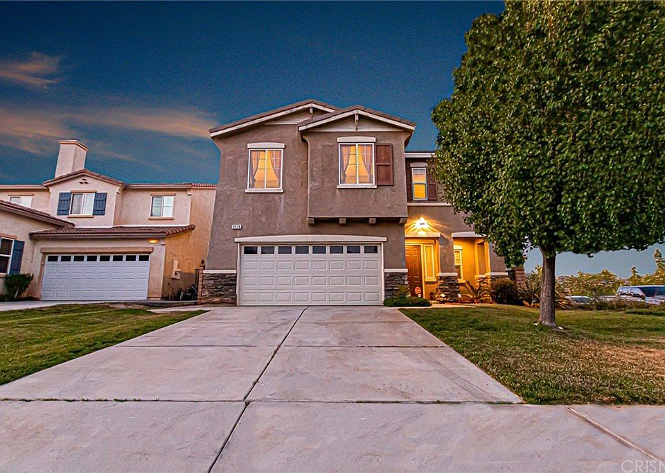 Nestled in esteemed Anaverde neighborhood of West Palmdale, find this two-story home sitting on a corner lot w/ luscious green grass, shrubbery & massive mature tree. Step inside & notice the bright neutral painted walls & travel along the beautiful laminate floors to the spacious living room w/ stunning fireplace. The living room opens up to the kitchen providing an open floor plan perfect for entertaining. The updated kitchen is fixed w/ a copious amount of freshly painted bright white upper & grey base cabinetry, plenty of quartz countertops w/ matching backsplash, mammoth center island & stainless steel appliances. Find recessed lighting throughout entire home. Upstairs, catch the loft & revel in the massive master suite w/ private bath fixed w/ double vanity, walk-in shower, sunken tub & walk-in closet. Notice 3 additional spacious bedrooms & upstairs laundry room. Finally, unwind in the sizable backyard & enjoy concrete slab, green grass & the privacy of block wall fencing.