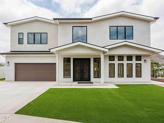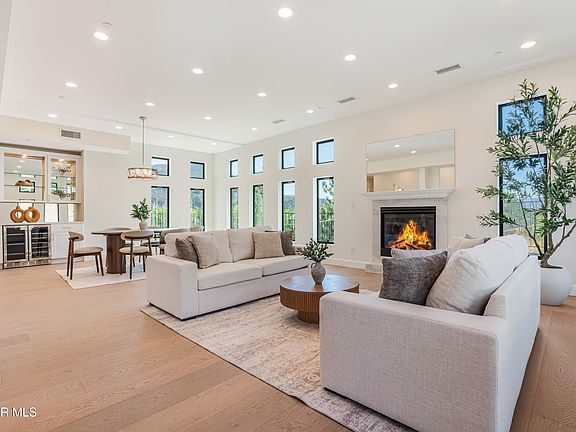 YOU MUST SEE THIS BRAND NEW CONSTRUCTION, built by Mohammad Moalej. Absolutely stunning estate located in West Simi Valley, presents a rare opportunity to own a modern 5-bedroom, 5.5-bath estate on a private gated lot with sweeping views of Mount McCoy and the Sinaloa Golf Course. With 4,500 square feet of living space and situated on a 20,563 square foot lot, this home is designed with a blend of contemporary architecture and thoughtful functionality. A shared private driveway leads to custom iron and glass double doors that open into a light-filled interior with soaring ceilings, engineered wide plank white oak flooring, and Milgard windows and doors throughout. The main level includes an inviting living room with fireplace, built-in bar with wine fridge, and hillside views. The open-concept kitchen features stainless steel KitchenAid appliance suite, quartz countertops, custom cabinetry with glass accents, elegant backsplash and gold accent hardware and pot filler. The oversized walk-in pantry will fit all of your necessities and more! The adjoining family room includes surround sound and large sliding doors that extend the living space onto a rear patio ideal for morning coffee or sunset views. The downstairs also includes a spacious guest bedroom with ensuite bath and custom closet organizers with golf course views, along with a powder room and cozy sitting nook. Upstairs, a central loft area separates the bedrooms for privacy. The expansive primary suite sits at the back of the home, showcasing panoramic views, a private balcony, a luxurious bath with marble flooring, oversized walk-in shower, soaking tub, dual vanities with custom hardware, a walk-in closet with custom organizers which is large enough to accommodate a jewelry/accessory island. Three additional upstairs bedrooms each feature ensuite baths. Two of the guest rooms are Junior primary guest suites, offering walk-in closets with custom organizers, en-suite full bathrooms with porcelain tile finishes, and lovely views. Convenient upstairs laundry room with additional storage. The home includes a 12-panel owned solar system, dual 5-ton HVAC units, tankless water heater, Cat 5/6 wiring, fire sprinklers, a finished two-car garage, new landscaping, and vinyl fencing. Every detail of this home was carefully curated to offer style, comfort, and high-end living in a private West Simi Valley setting. There is nothing else on the market like this fantastic property!