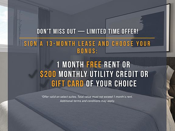 - Special offer! Limited Time Offer - Get 1 Month FREE Rent on a 13-month lease, OR choose a $200 monthly utility credit on a 13-month lease, OR select a gift card of your choice. - *Offer valid on select suites. Value must not exceed 1 month's rent value. Additional terms and conditions may apply.